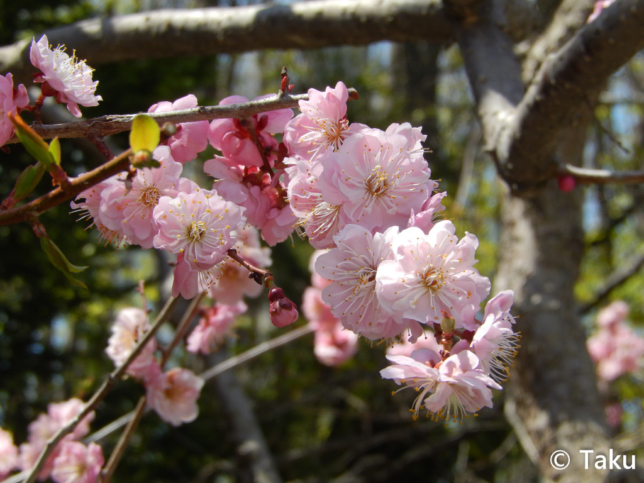 お目当ては、紅梅・白梅・スモモが咲き誇る梅林です。平日の昼間にも関わらず、多くの人で賑わっていました。